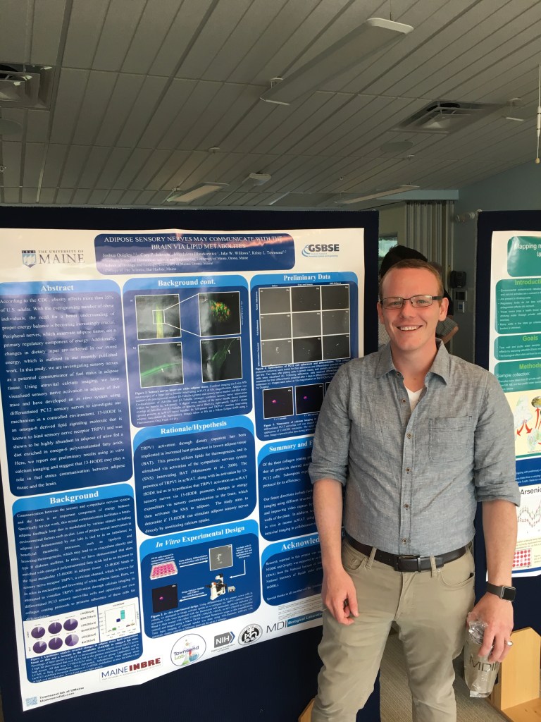 Lab members Josh Quigley (INBRE, COA) and Chris Aniapam (NSF iMACBio summer student from SMCC) presented at the 46th annual INBRE symposium at the MDI Biological Laboratory. (Pictured: Josh Quigley)