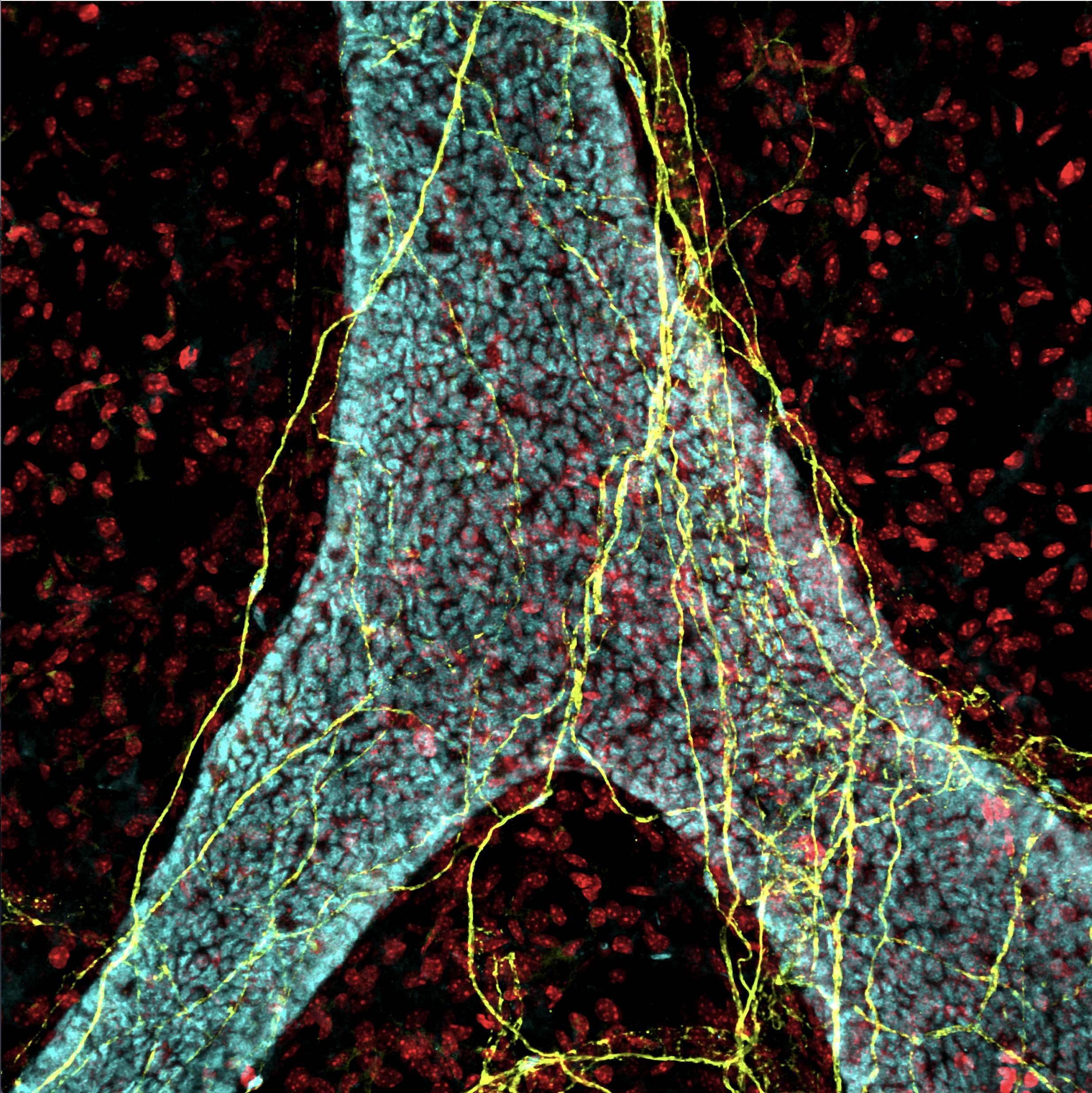 Award-winning image by Jake Willows (Ph.D. student in the Townsend Lab and Neuroscience Graduate Program at OSU), taking first prize at the 2022 Neuroscience Research Institute (NRI) Annual Retreat. Image is of a lymphatic vessel in adipose tissue (teal), innervated by peripheral nerves (yellow).